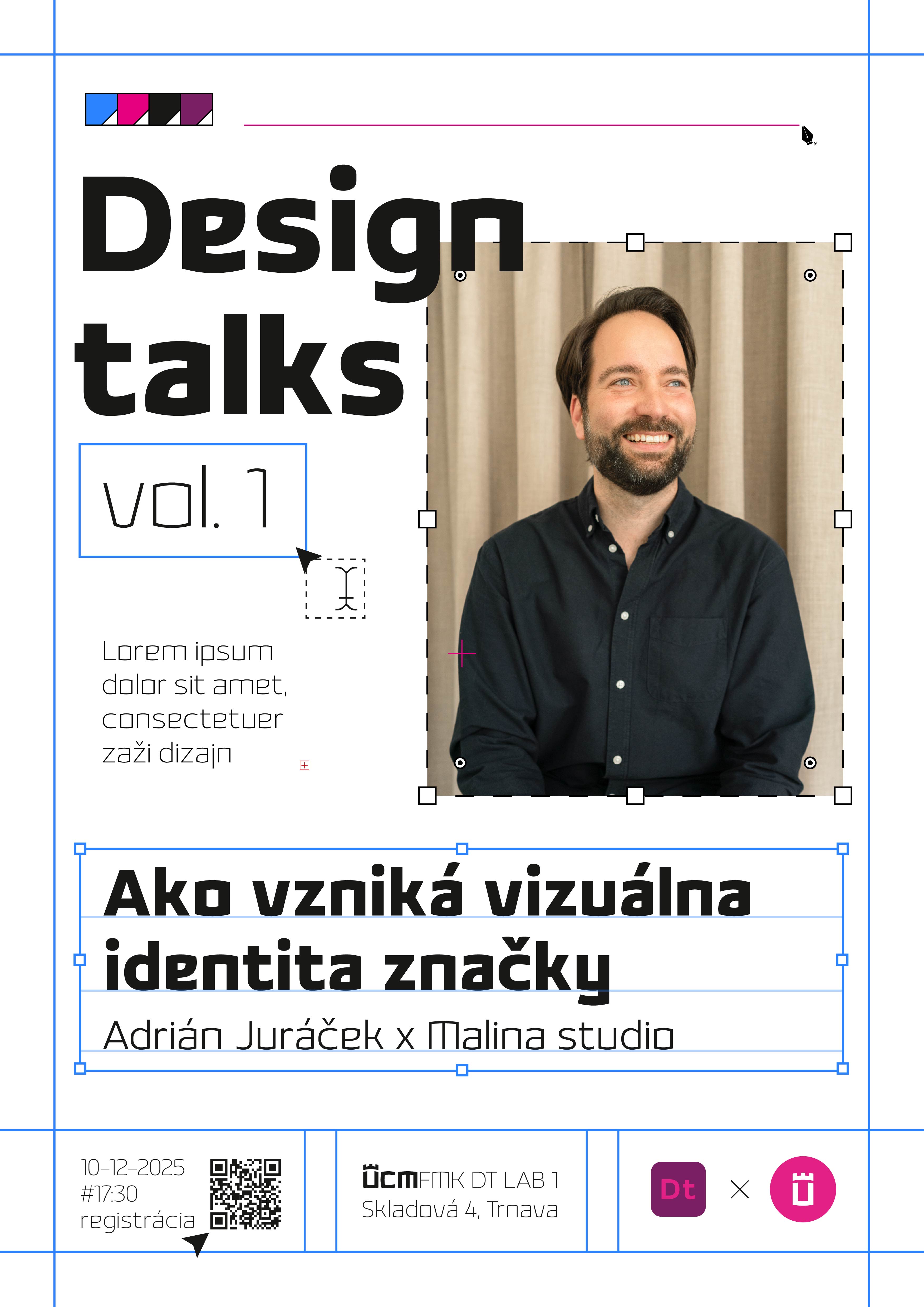 Prvým hosťom série bude Adrián Juráček, dizajnér a zakladateľ Malina Studio. Úvodná prednáška otvorí tému vizuálnej identity a značiek.