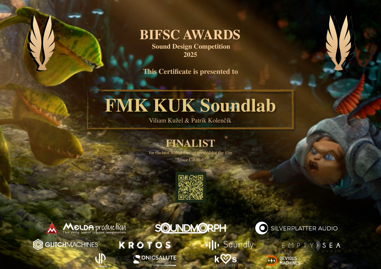 Doktor Patrik Kolenčík a študent Viliam Kužel sa zúčastnili prestížnej medzinárodnej súťaže pre zvukových dizajnérov – Berlin International Film Scoring Competition (BIFSC). Pod názvom FMK KUK SoundLab sa im svojou prácou podarilo prebojovať až do finále.