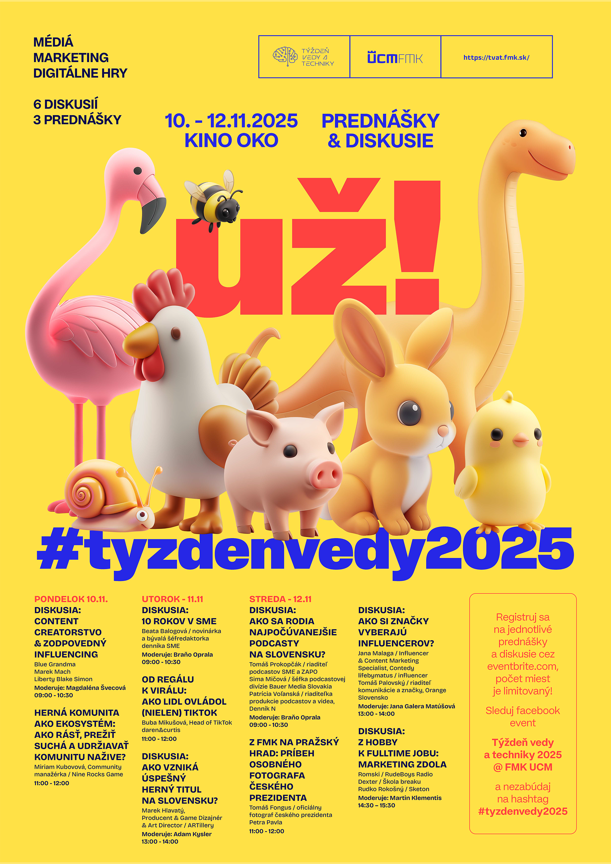 Študenti sa na jednotlivé prednášky a diskusie budú registrovať cez Eventbrite, ale miesto nájdu aj takí, ktorí to nestihnú. Registrácia cez Eventbrite bude spustená v nedeľu 3. 11. 2025 o 18:00 hod.